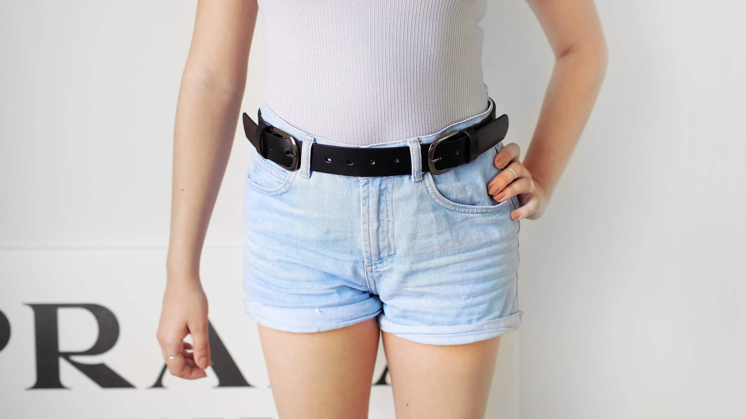 Start with two matching or similar belts. Cut the first belt at the spot that would fit slightly less than half way around your waist.