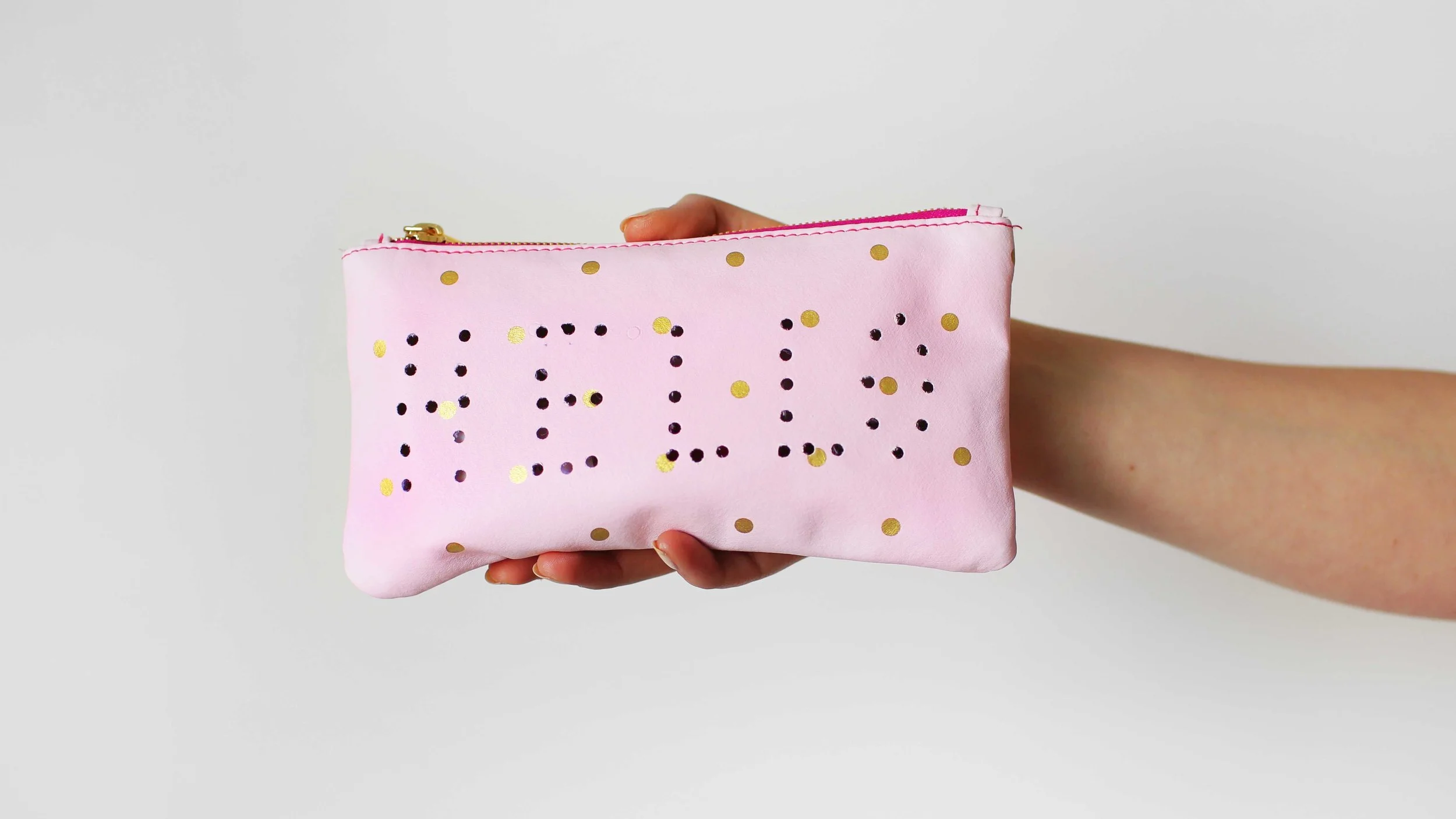 Start by writing out your word on a piece of paper the size of your bag. Make sure to space your letters out more than you usually would. With a maker, figure out the spacing of your holes. Start at the ends of the letters and intersecting points, add dots and then fill in the gaps where necessary.