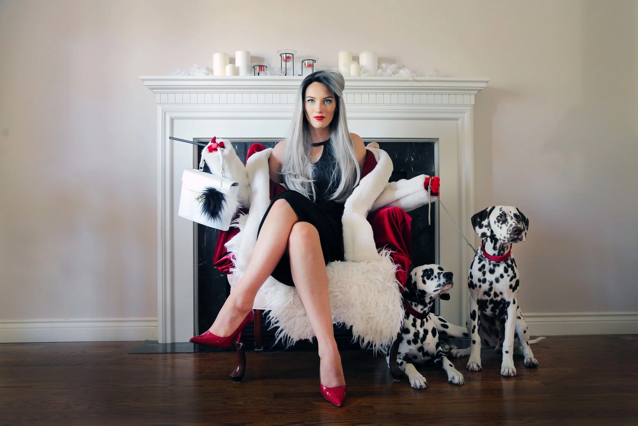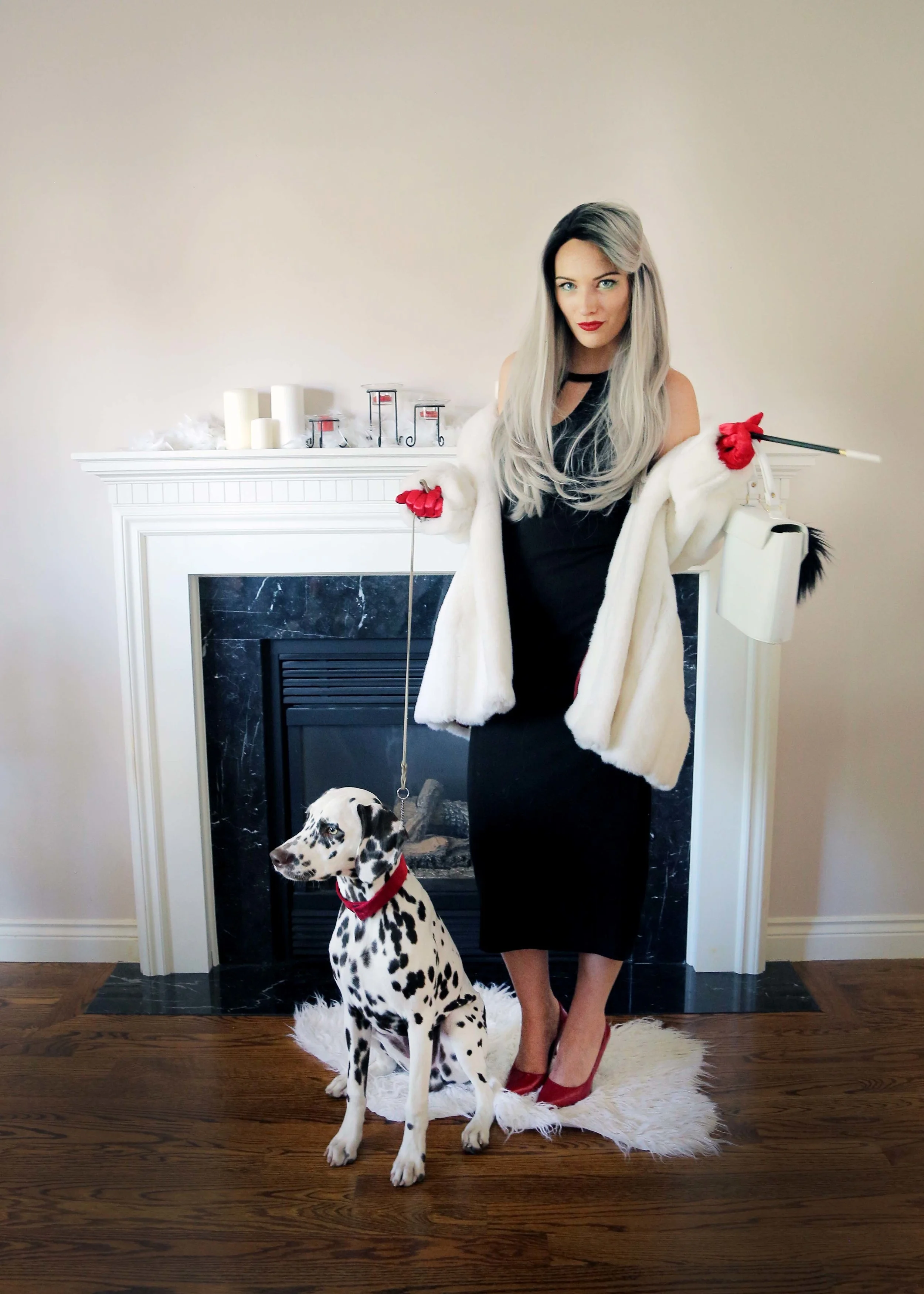 To put this entire look together we added a long black dress, red pointy heels, some silky red gloves and two adorable dalmatian dogs courtesy of my (Kelsey’s) Aunt!