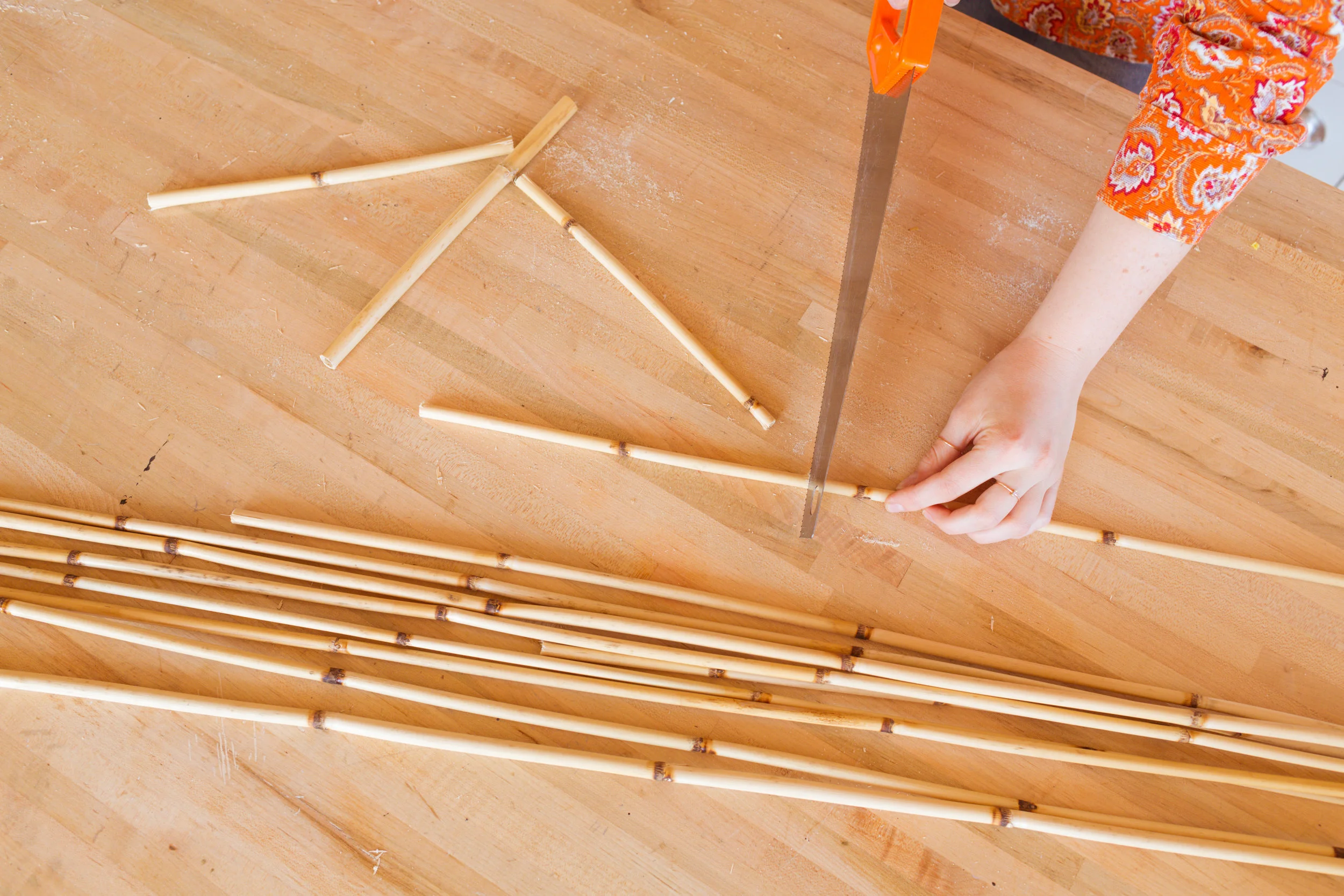 Time to wood glue our house together! Make sure you keep the two wider pieces on opposite sides from each other. Glue all the way around the edges of the pieces, joining all the pieces on the sides and the at the bottom to the back piece. You can use tape to hold everything together while it dries. Next you’ll need some bamboo sticks! These usually come hollow, which is exactly what we need! Cut these the length of our box. You’ll need enough to fit snug inside of the box.