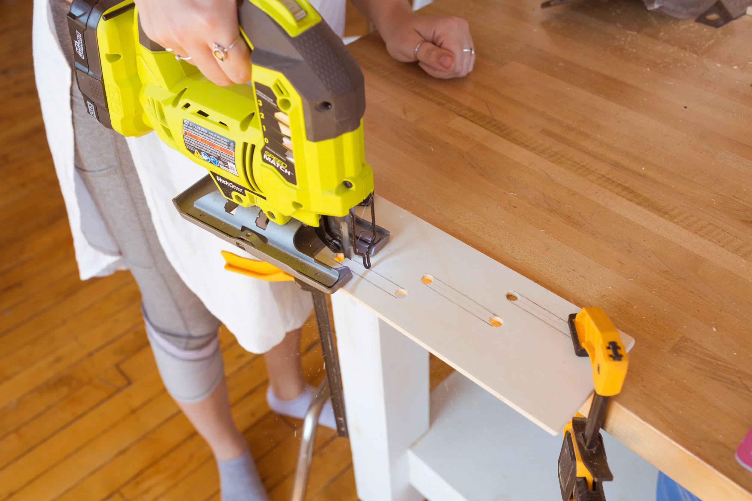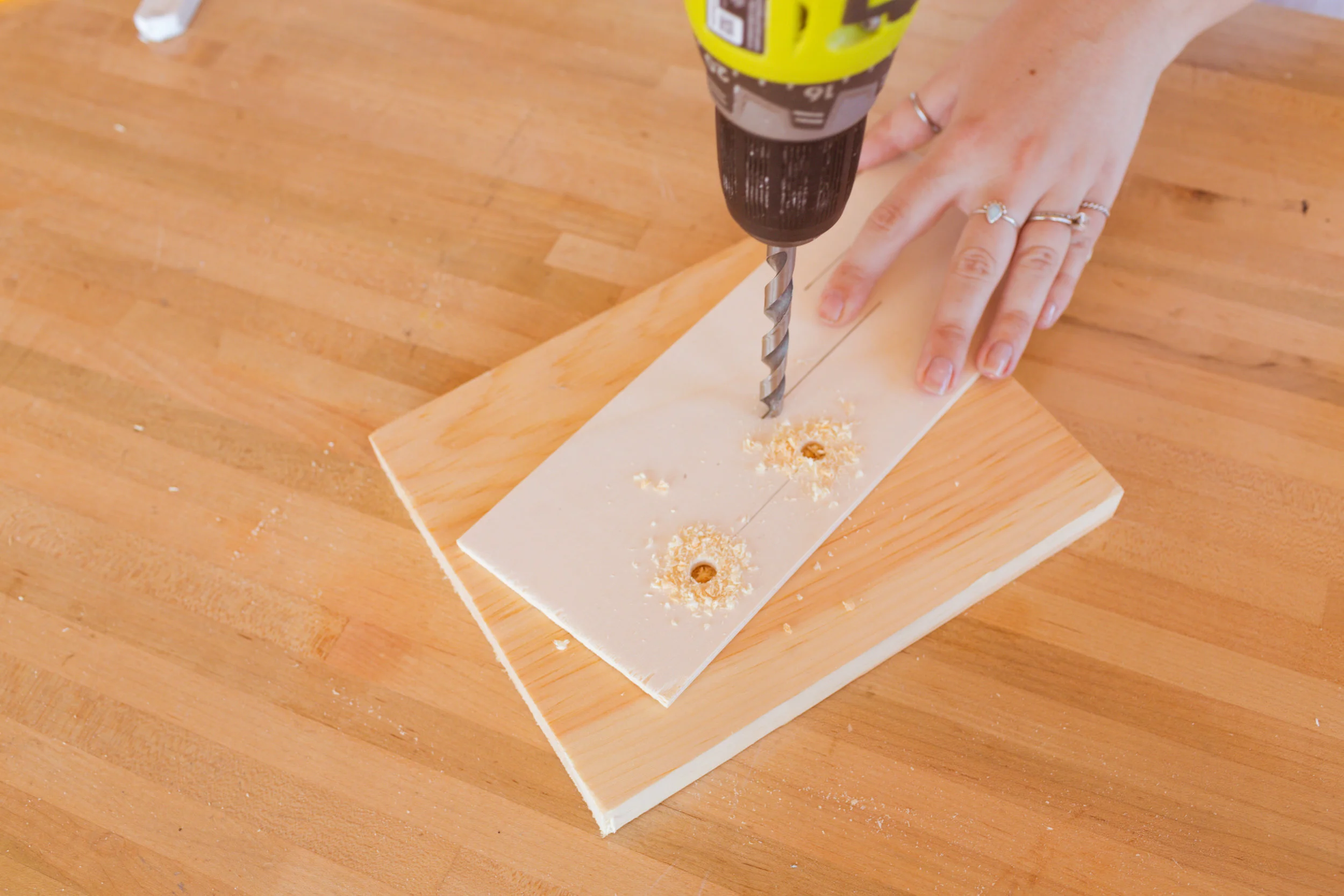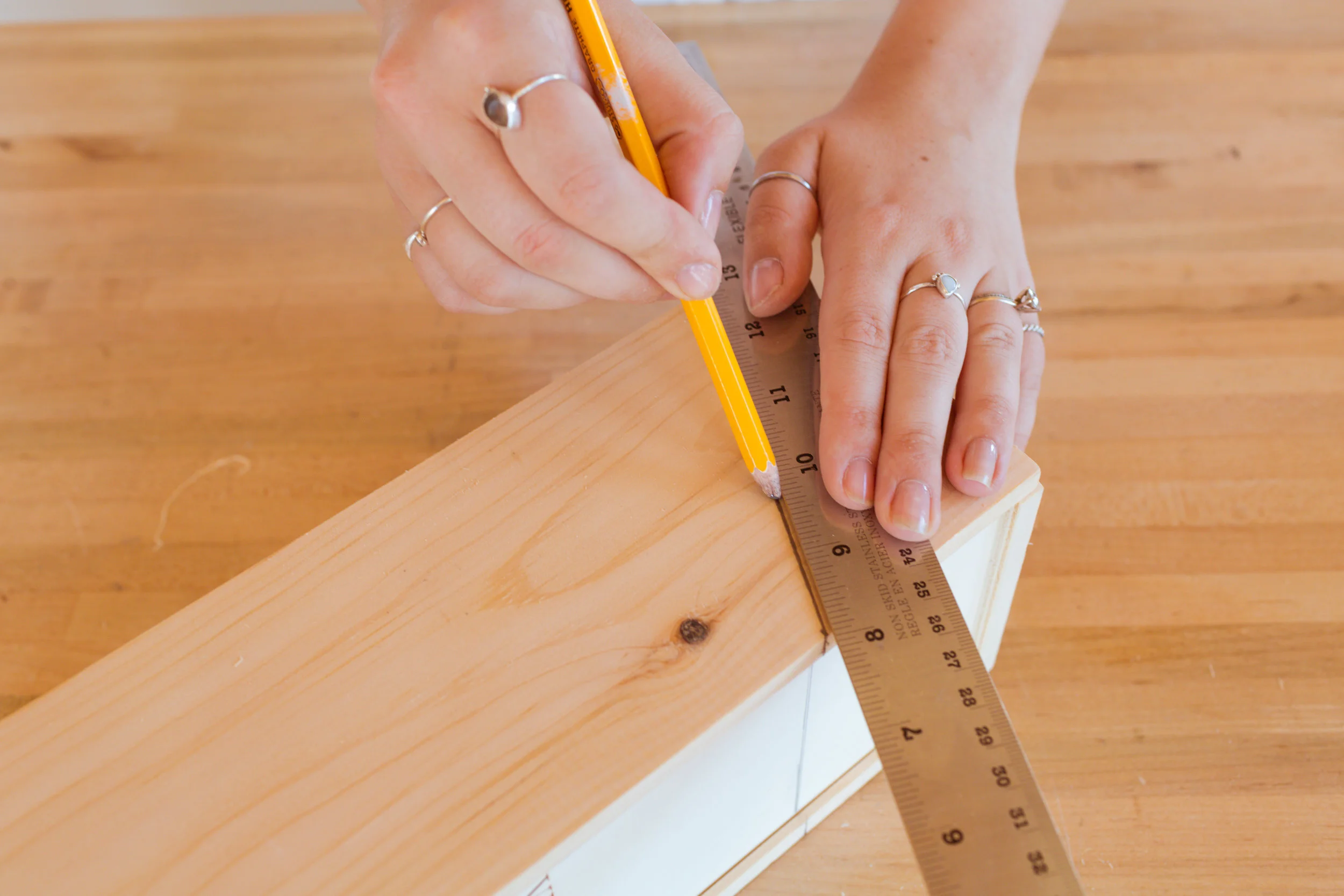 Start with your ¼ inch piece of plywood. Start by drawing out two pieces that are 5 ¼ inches wide and 2’ long. Cut these out using a hand or circular saw. A great tip is to use a scrap piece of lumber as a ruler to make sure you are cutting a straight line.