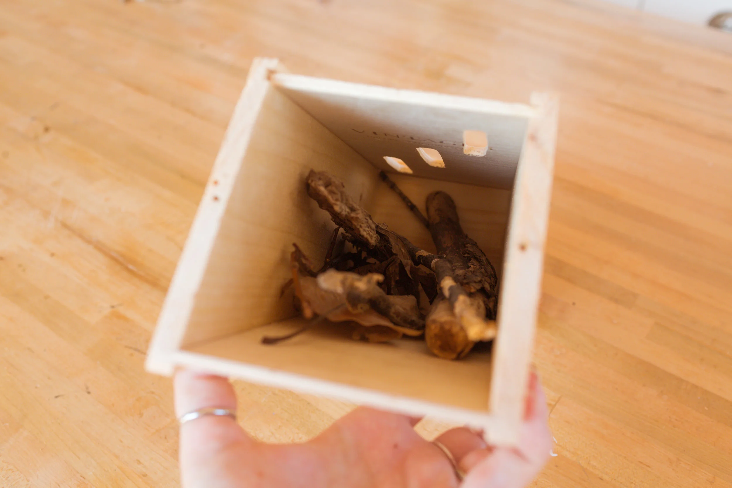 Make sure to add twigs, leaves, and bark inside of the house before you close it all up!