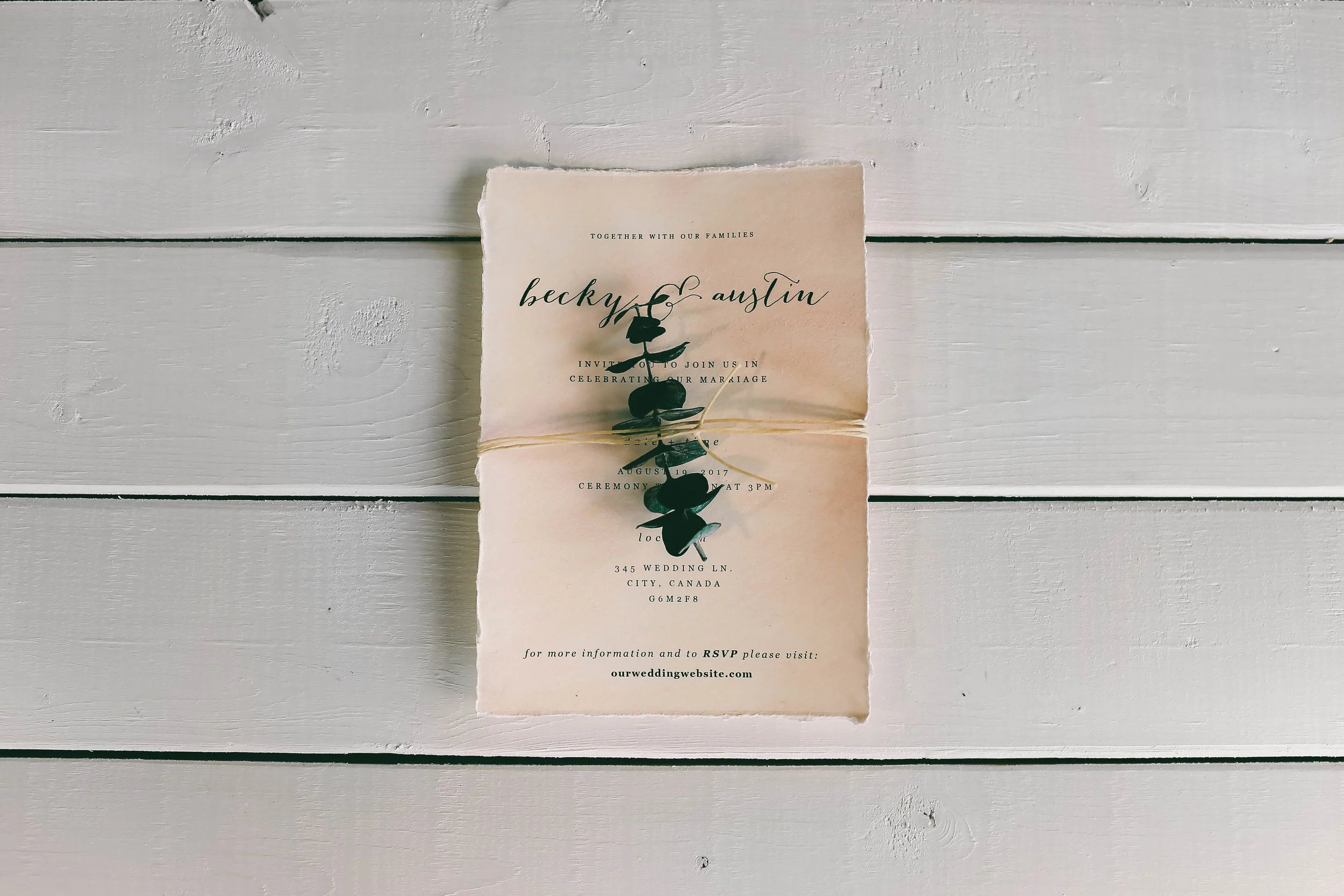 To add detail to the invitations, I am wrapping waxed thread around a couple of times and tying it into a knot. I used small bits of dried eucalyptus to add some more decoration. I placed the eucalyptus underneath the waxed thread.