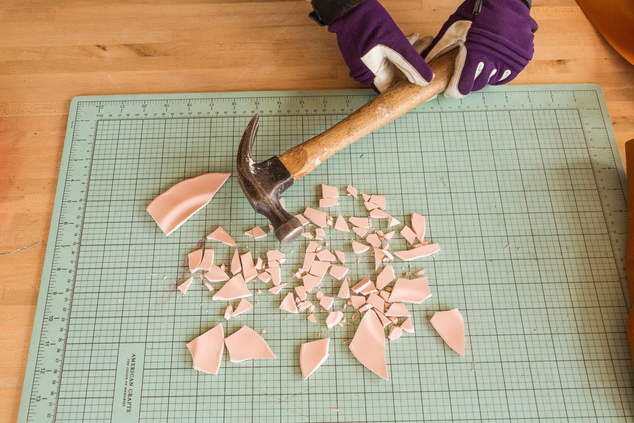 Start off by breaking up your ceramic plates of choice! Place your plates under a piece of thick fabric and use a hammer to break everything up. Set those pieces aside.