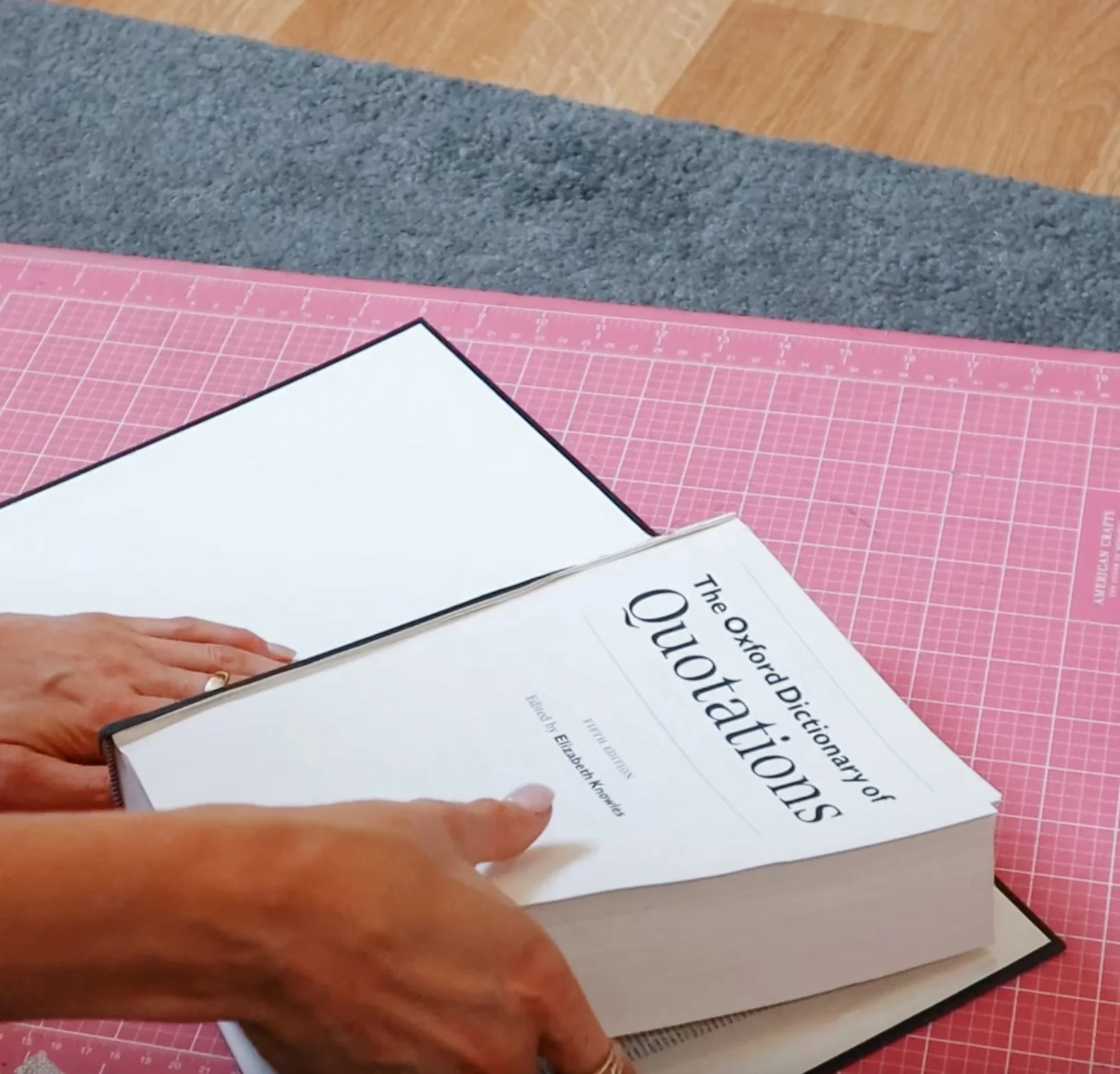 I took to the thrift store and got a book that I liked the cover. Using a utility knife I cut out the inside of the book, making sure to keep it in tack so I can read it later if I want!
