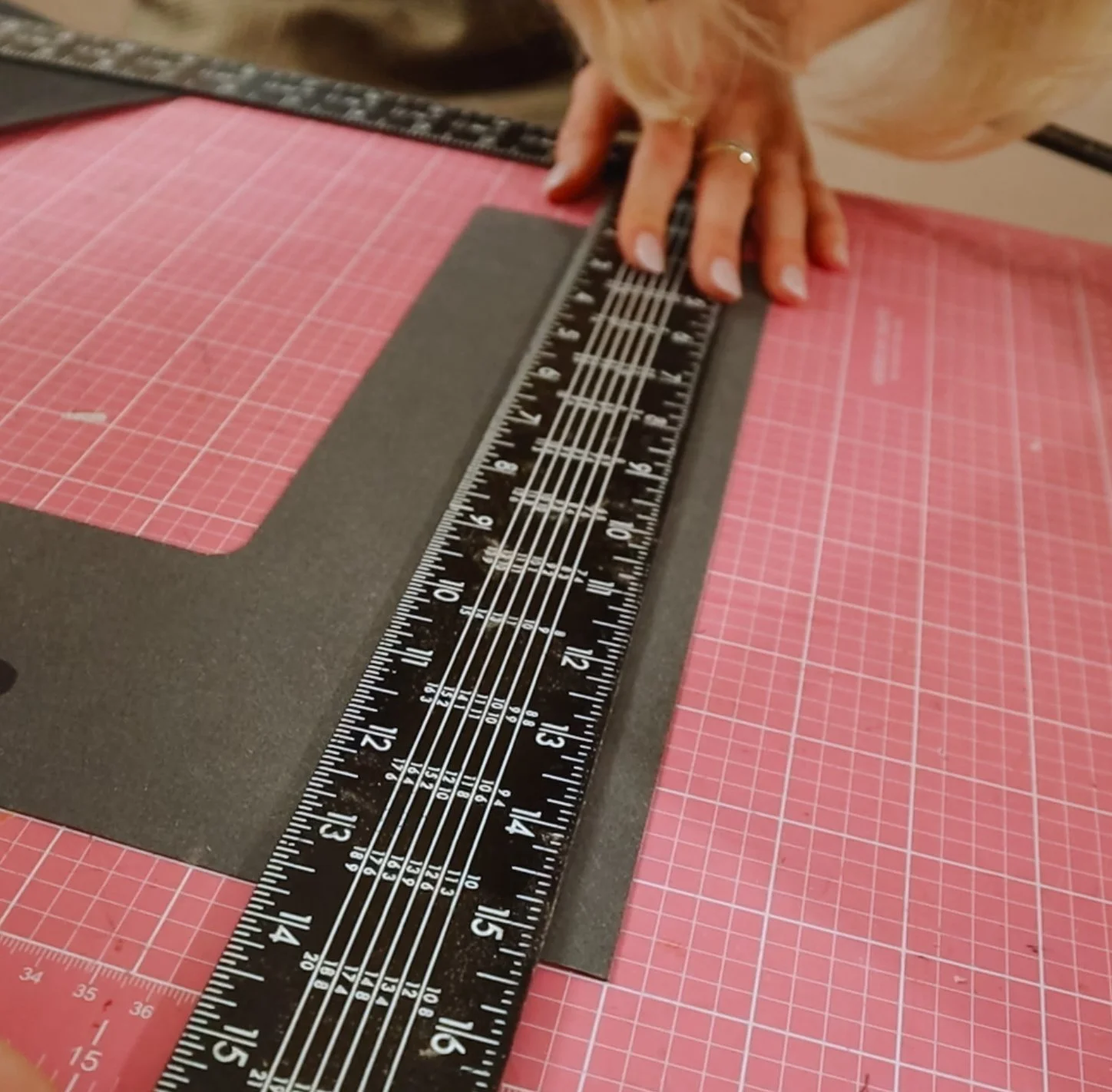 The sheet I am using is ½” thick. To cut this, I am going to take a straight edge ruler and place it firmly on the board. Mark out the thickness I would like to cut and taking my utility knife, I made a score line. Do a couple passes until you are about ¼ way through the board.