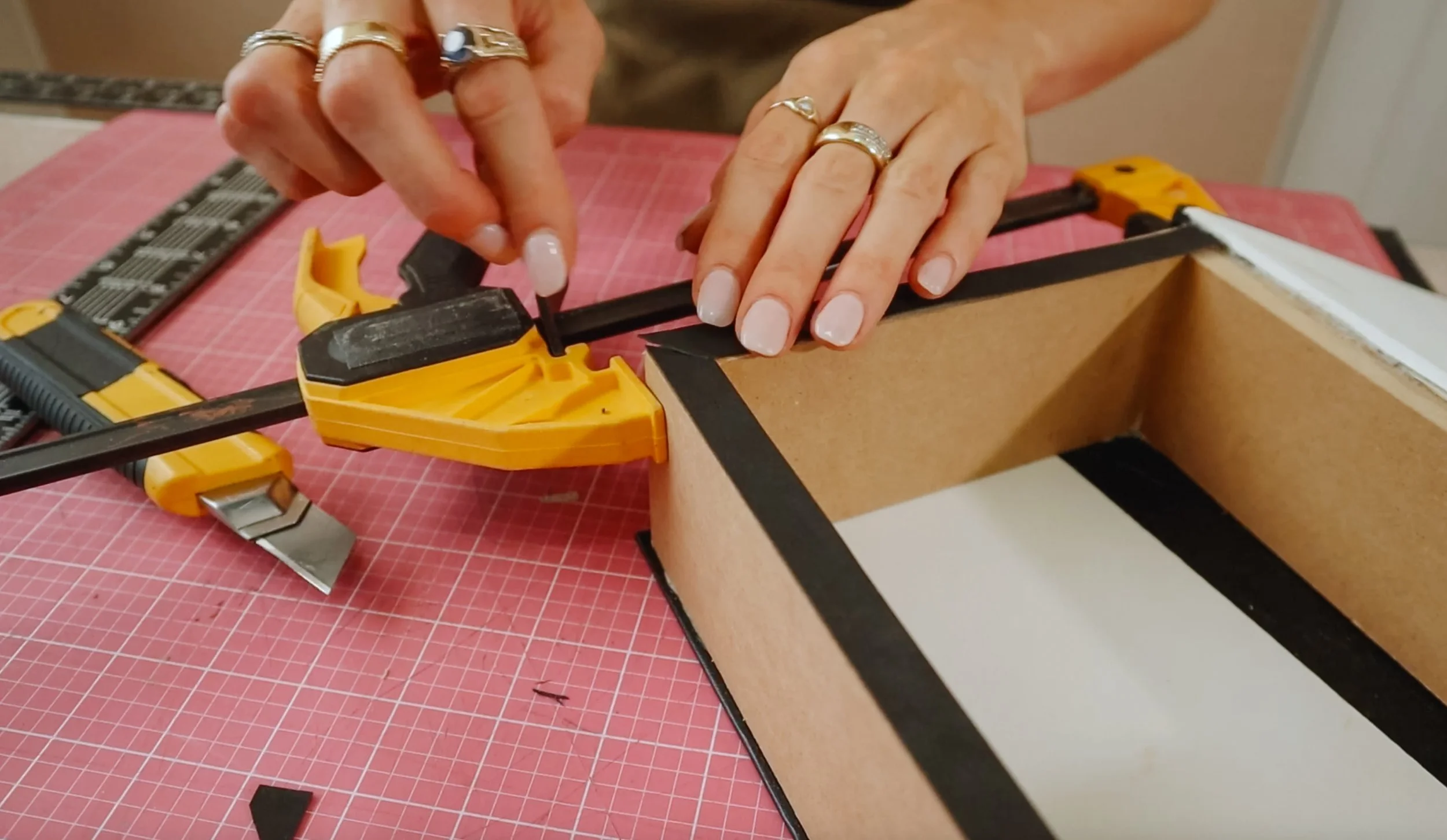 While it dried, I got some faux leather sheets to cover any raw surfaces on the inside to make it look cleaner. I used the same glue and clamps and let it try on the surfaces.